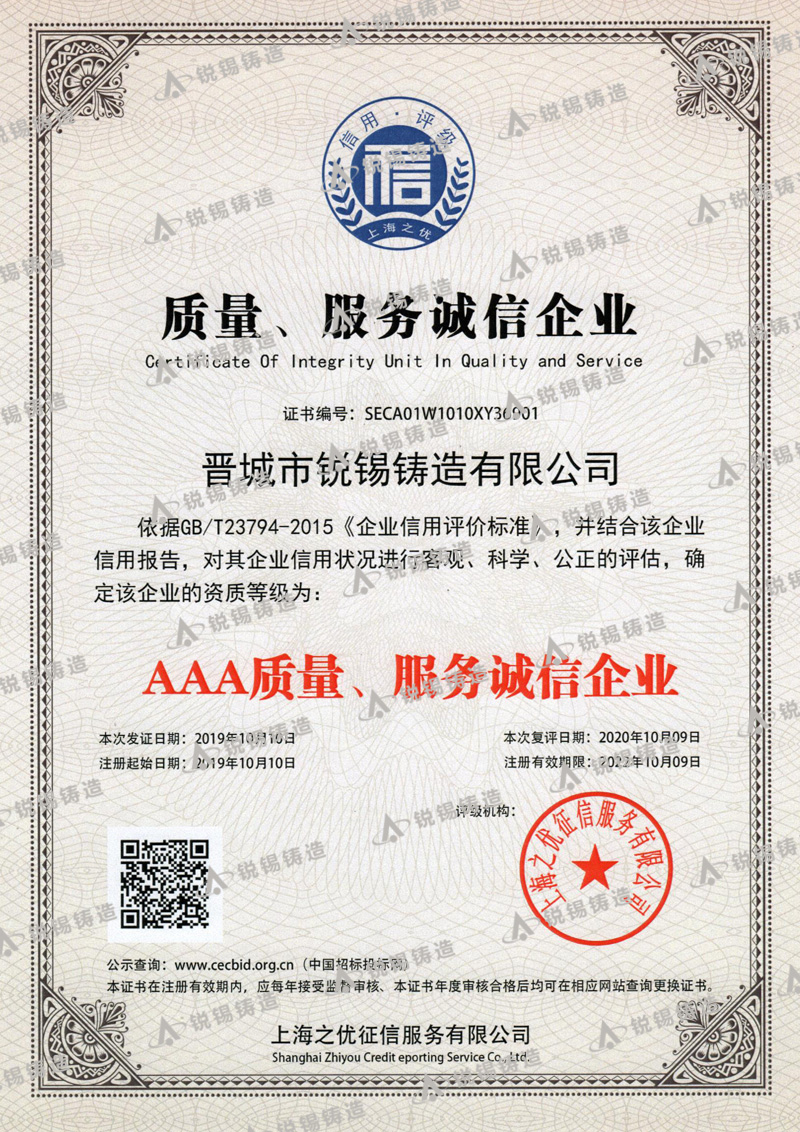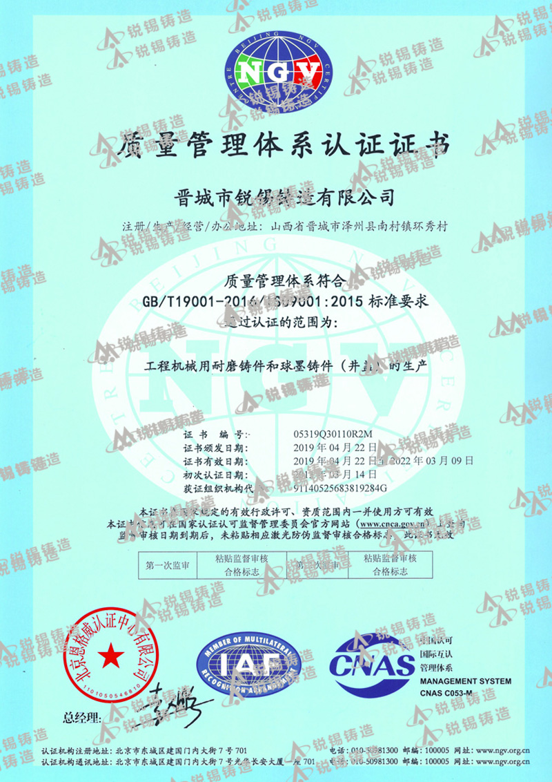 我公司生產(chǎn)的銳錫牌球墨鑄鐵件和鑄鋼件有嚴格的質(zhì)量管理,嚴格按照CB/T 23858-2009和GB/T 25628-2010 標準進行生產(chǎn)制造,公司